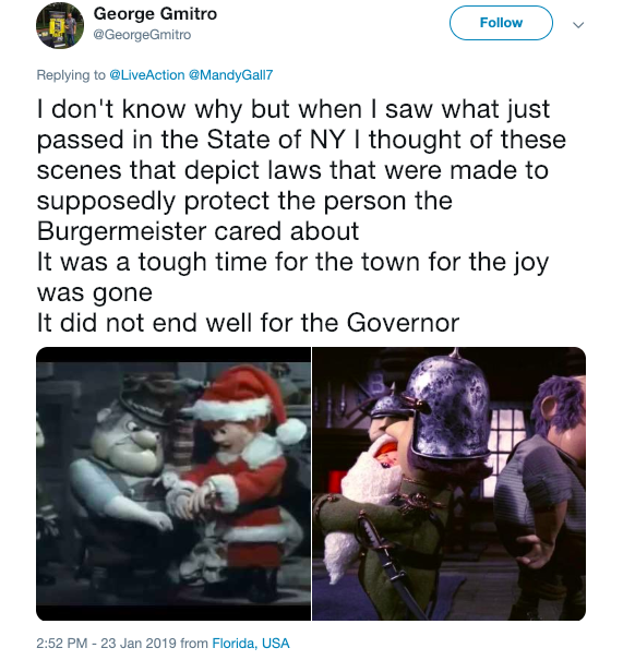 This twitter user had an interesting comparison between New York Gov. Cuomo and the Governor in the movie “Santa Claus is Comin’ to Town”.