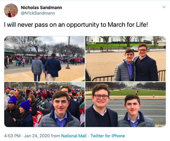 Sandmann posted photos on Twitter of his 2020 March for Life experience, saying he will “never pass on an opportunity to March for Life!”