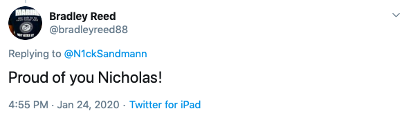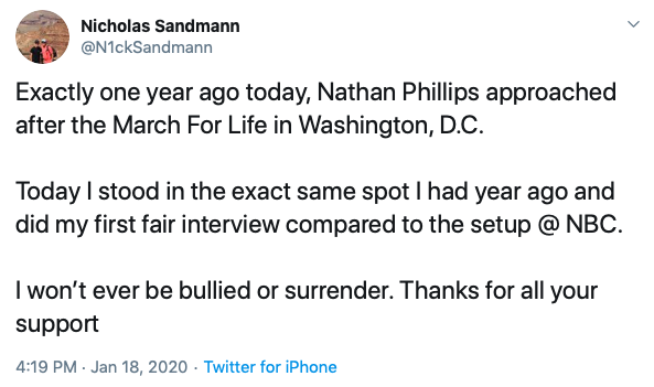 Sandmann’s full tweet reads, “Exactly one year ago today, Nathan Phillips approached after the March For Life in Washington, D.C. / Today I stood in the exact same spot I had a year ago and did my first fair interview compared to the setup @ NBC. / I won’t ever be bullied or surrender. / Thanks for all your support.”