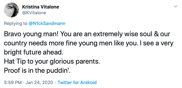 Another user said, “Bravo young man! You are an extremely wise soul & our country needs more fine young men like you. I see a very bright future ahead. / Hat Tip to your glorious parents. / Proof is in the puddin’.”