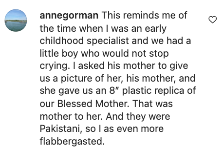 One Instagram user said, “This reminds me of the time when I was an early childhood specialist and we had a little boy who would not stop crying. I asked his mother to give us a picture of her, his mother, and she gave us an 8” plastic replica of our Blessed Mother. That was mother to her. And they were Pakistani, so I as even more flabbergasted.”