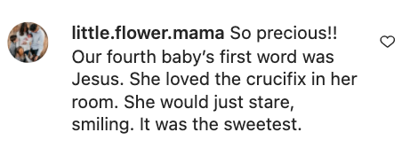 Another user commented, “So precious!! Our fourth baby’s first word was Jesus. She loved the crucifix in her room. She would just stare, smiling. It was the sweetest.”