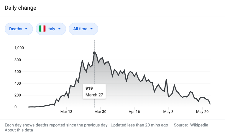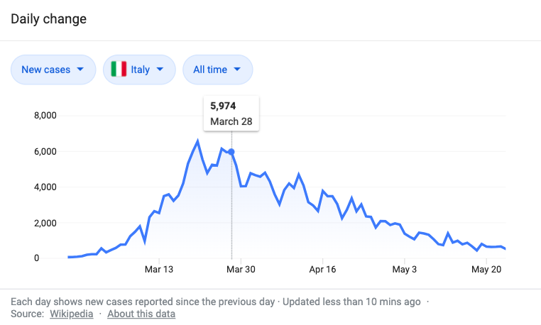 Following that date, the rate of new daily deaths and cases dropped in Italy.