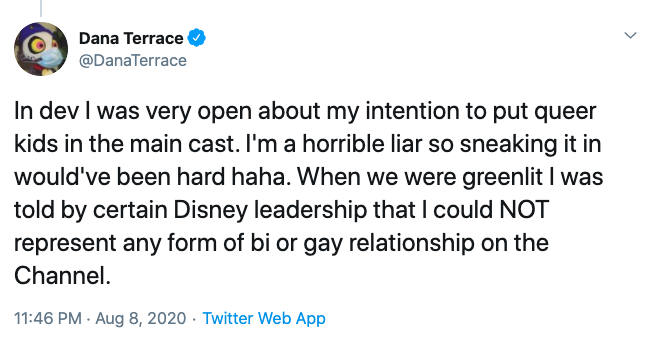 Terrace’s first tweet reads, “In [development], I was very open about my intention to put queer kids in the main cast. I’m a horrible liar, so sneaking it in would’ve been hard, haha. When we were green-lit, I was told by certain Disney leadership that I could NOT represent any form of [bisexual] or gay relationship on the channel.”