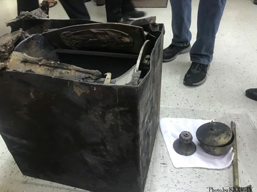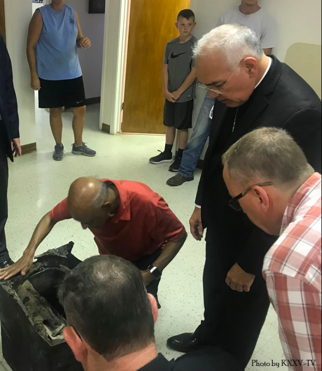 On the day of the fire, the Diocese of Austin reported on Facebook that “Bishop Joe Vásquez and Father Edwin Kagoo, pastor of Church of the Visitation in Westphalia, inspect the tabernacle, which was removed from the rubble of the church fire.