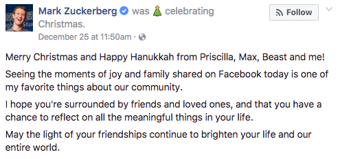Zuckerberg shared his new ideas about religion in a comment thread on a post he made about Christmas. “Merry Christmas,” he posted on his page, “and Happy Hanukkah from Priscilla, Max, Beast and me!”