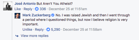 Since Zuckerberg had previously publicly identified himself as an atheist, a commenter asked, “But Aren’t You Atheist? [sic]” Zuckerberg replied: “No. I was raised Jewish and then I went through a period where I questioned things, but now I believe religion is very important.”