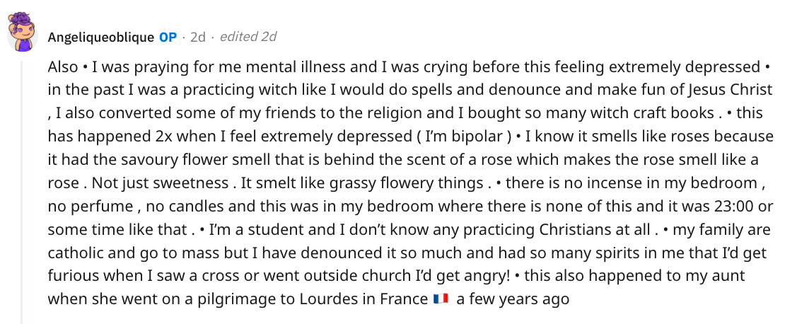 “I hope this doesn’t get down voted, removed or people saying it’s fake, as I just want to inspire people. After it happened, I smelled all over my room and there was no rose smell to be found.”