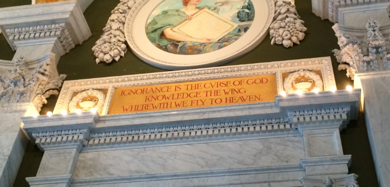 The interior is filled with various quotes related to the pursuit of knowledge either painted on or etched into the walls, some of which invoke God. They include:
