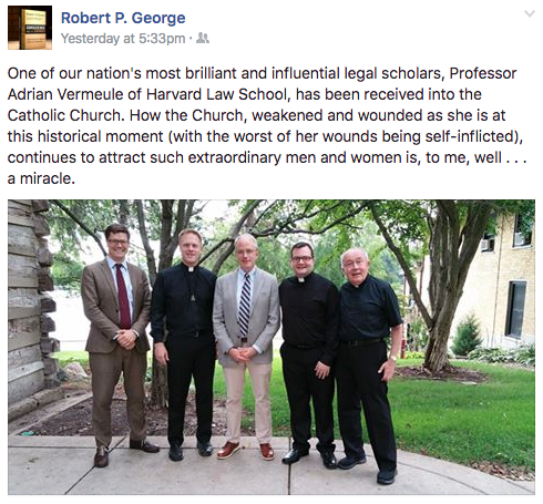 “One of our nation’s most brilliant and influential legal scholars, Professor Adrian Vermeule of Harvard Law School, has been received into the Catholic Church. How the Church, weakened and wounded as she is at this historical moment (with the worst of her wounds being self-inflicted), continues to attract such extraordinary men and women is, to me, well . . . a miracle.”