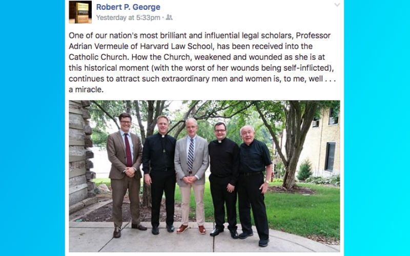 Harvard law professor Adrian Vermeule was recently received into the Catholic Church, reports Princeton law professor Robert George, himself also Catholic, on Facebook.