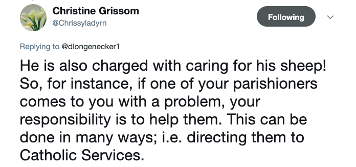 Another Twitter user added, “He is also charged with caring for his sheep! So, for instance, if one of your parishioners comes to you with a problem, your responsibility is to help them. This can be done in many ways; i.e. directing them to Catholic Services.”