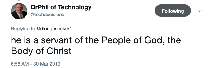 This user responded, “He is a servant of the People of God, the Body of Christ.”