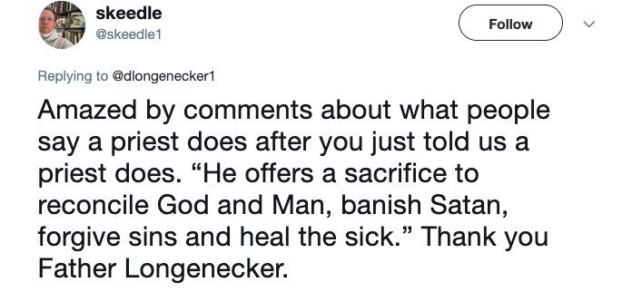 This user responded, “Amazed by comments about what people say a priest does after you just told us a priest does. “He offers a sacrifice to reconcile God and Man, banish Satan, forgive sins and heal the sick.” Thank you Father Longenecker.”