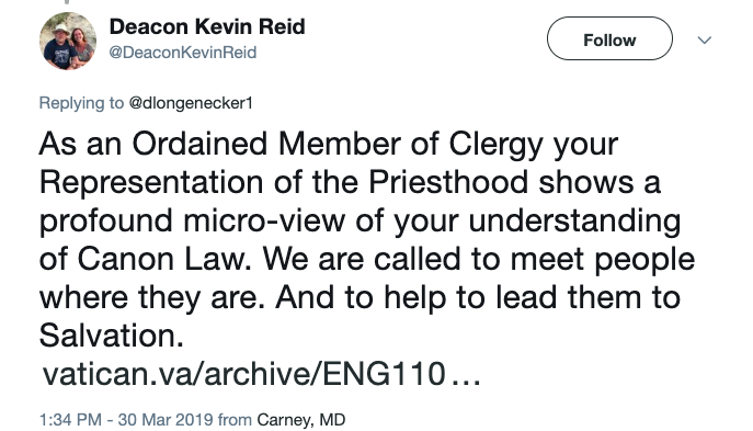 This Twitter user responded, “As an Ordained Member of Clergy your Representation of the Priesthood shows a profound micro-view of your understanding of Canon Law. We are called to meet people where they are. And to help to lead them to Salvation.”