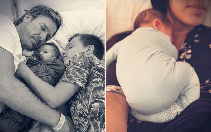 The caption for the two photos above read, “Our baby boy, Crew Gaines, is here and we couldn’t be more in love. He made an unexpected (and speedy) entrance into the world two and a half weeks early – which is fitting given he was a sweet surprise from day one. Thank you for all your thoughts and prayers. We are so grateful.”