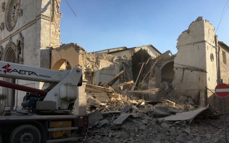 The basilica is built over the traditional birthplace of St. Benedict and his twin sister St. Scholastic. Parts of it date back to the 14th century. The earthquake was a 6.6 on the Richter scale, with its epicenter in central Italy.