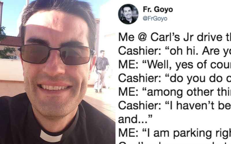 The tweet reads: “Me @ Carl’s Jr drive through / Cashier: “oh hi. Are you a real priest?” / ME: “Well, yes of course.” / Cashier: “do you do confessions?” / ME: “among other things.” / Cashier: “I haven’t been in many years and…” / ME: “I am parking right now.” / God’s always ready to forgive / #BeReadytoo”.