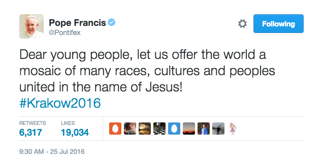 It reads: “Dear young people, let us offer the world a mosaic of many races, cultures and peoples united in the name of Jesus! #Krakow2016”