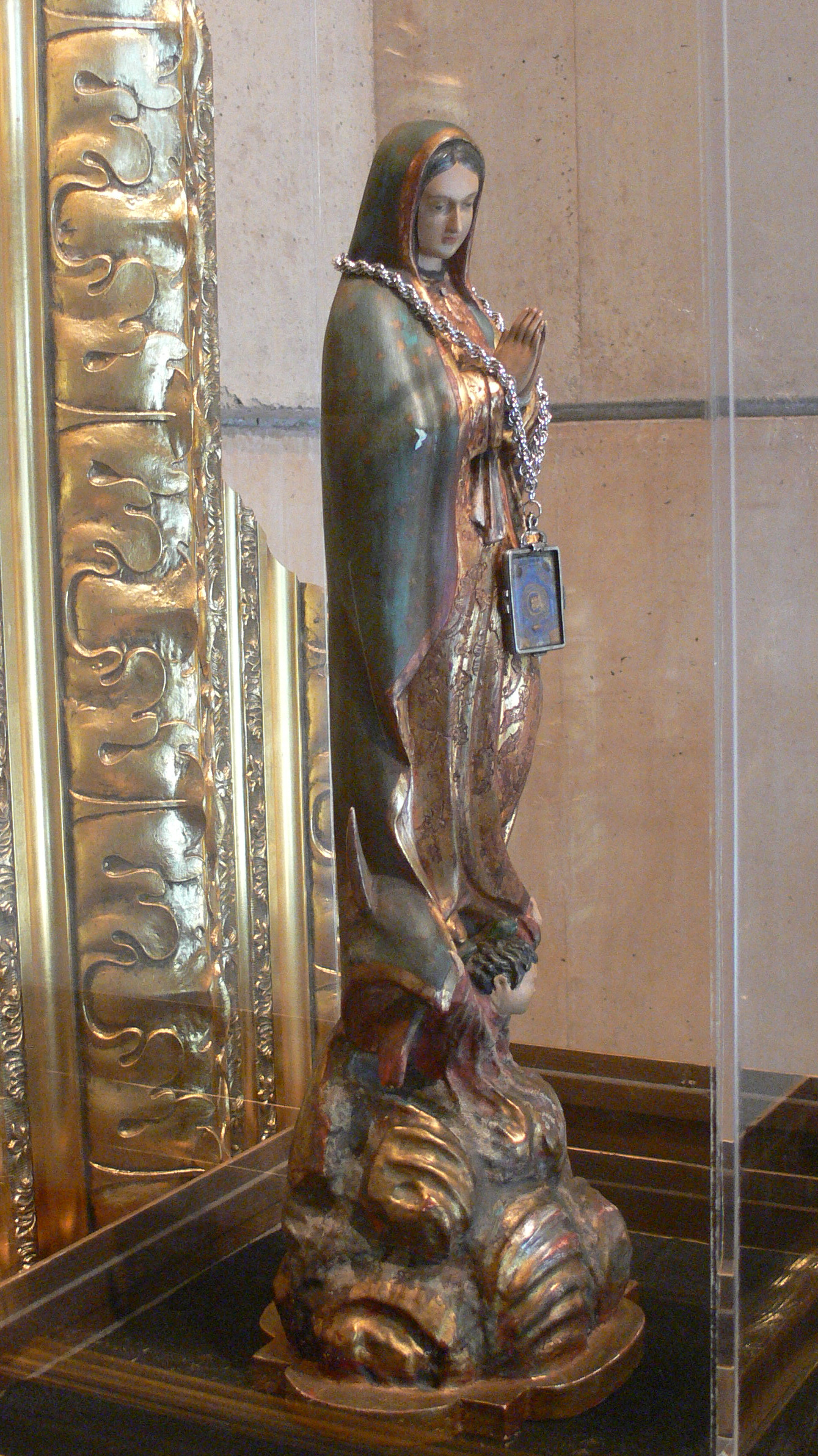 A piece of the original tilma of Our Lady of Guadalupe (in the case hanging from the chain):