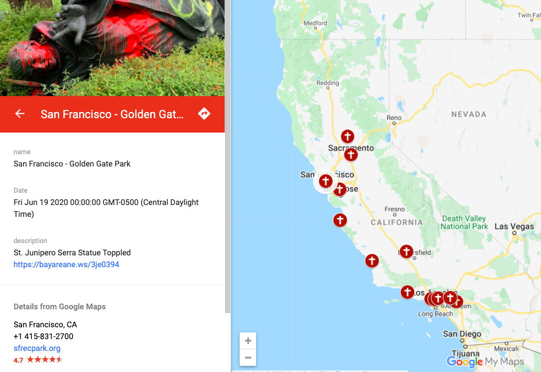 The map shows the attacks on “Catholic statues, parishes and persons.” It consists of clickable crosses, directing users to each attack location.