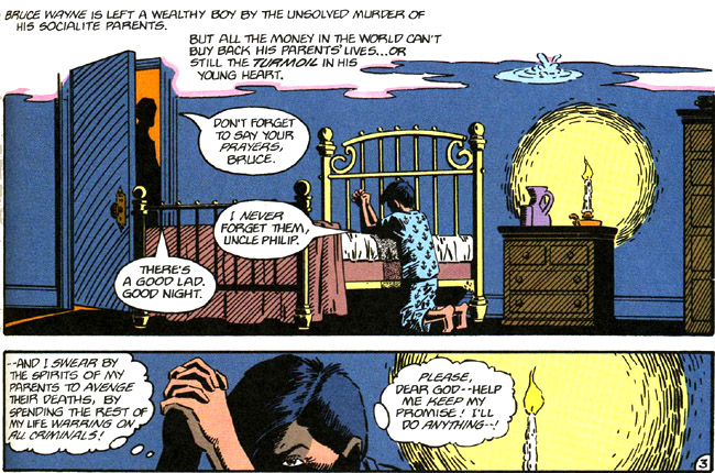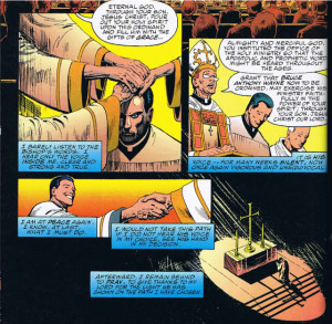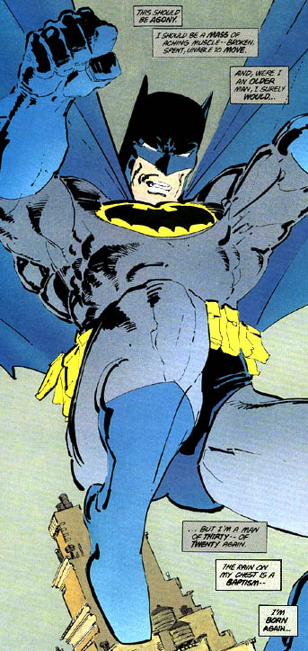 In the 1986 Batman: The Dark Knight Returns (considered non-canon), Batman is returning to crimefighting after a 10 year hiatus, and he uses sacramental imagery to describe how he’s feeling: “This should be agony. I should be a mass of aching muscle – broken, spent, unable to move. And were I an older man, I surely would… But I’m a man of thirty – of twenty again. The rain on my chest is a baptism – I’m born again…”