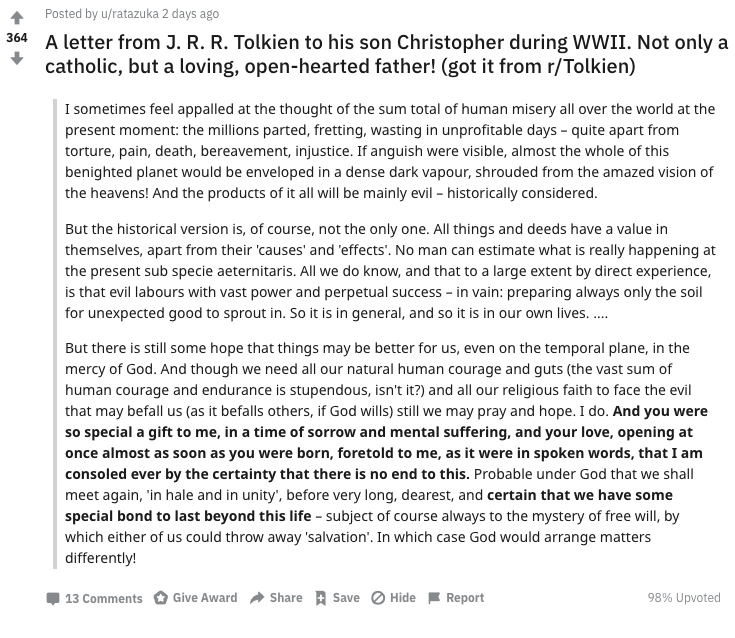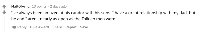 Another user said, “I’ve always been amazed at his candor with his sons. I have a great relationship with my dad, but he and I aren’t nearly as open as the Tolkien men were..”