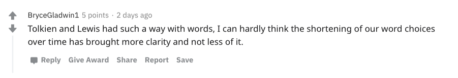 This user added, “Tolkien and Lewis had such a way with words. I can hardly think the shortening of our word choices over time has brought more clarity and not less of it.”