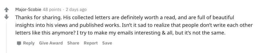 This user said, “Thanks for sharing. His collected letters are definitely worth a read, and are full of beautiful insights into his views and published works. Isn’t it sad to realize that people don’t write each other letters like this anymore? I try to make my emails interesting & all, but it’s not the same.”