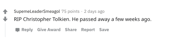 The user commented, “RIP Christopher Tolkien. He passed away a few weeks ago.”