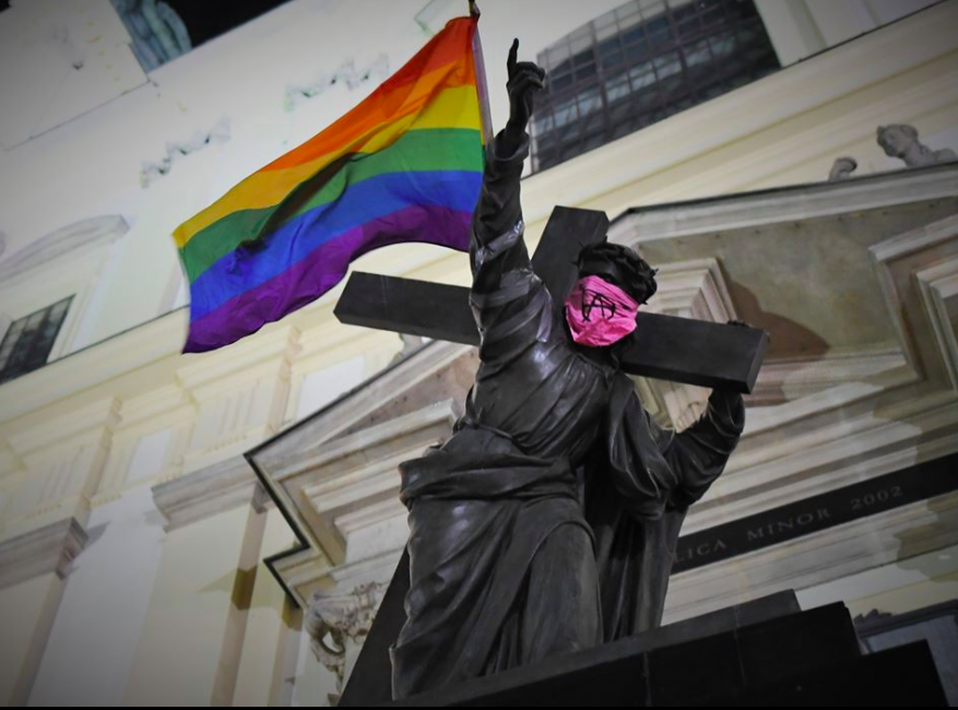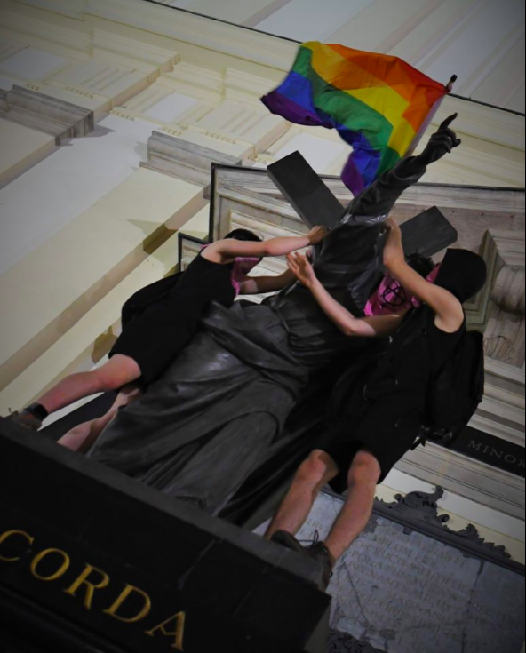 Anarchists and gay pride activists desecrated a monument of Jesus carrying the cross yesterday in Warsaw, Poland. The group tied a bandana with the Anarchist symbol around Jesus’ mouth, and placed a rainbow flag on the cross.
