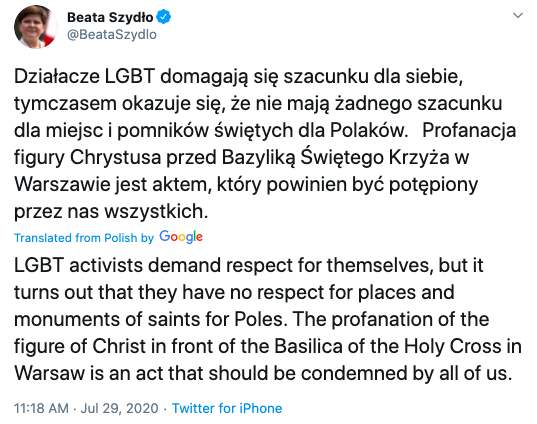 Szydło’s full tweet reads, “LGBT activists demand respect for themselves, but it turns out that they have no respect for places and monuments of saints for Poles. The profanation of the figure of Christ in front of the Basilica of the Holy Cross in Warsaw is an act that should be condemned by all of us.”