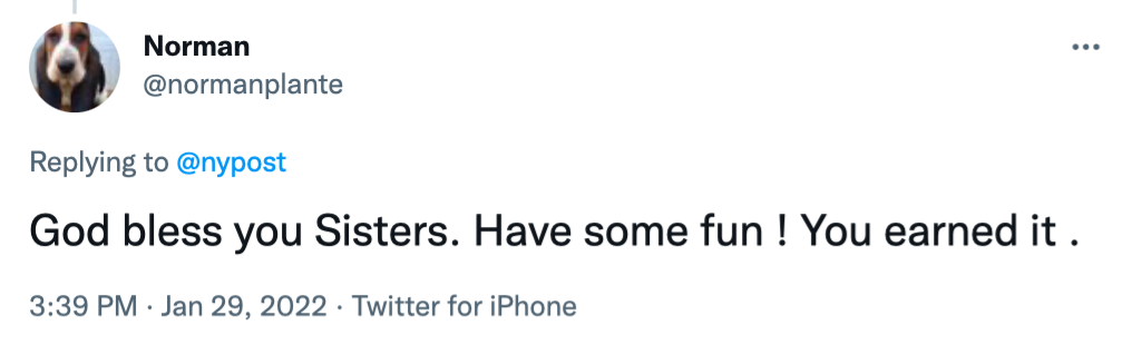 This user also said, “God bless you, Sisters. Have some fun! You earned it.”