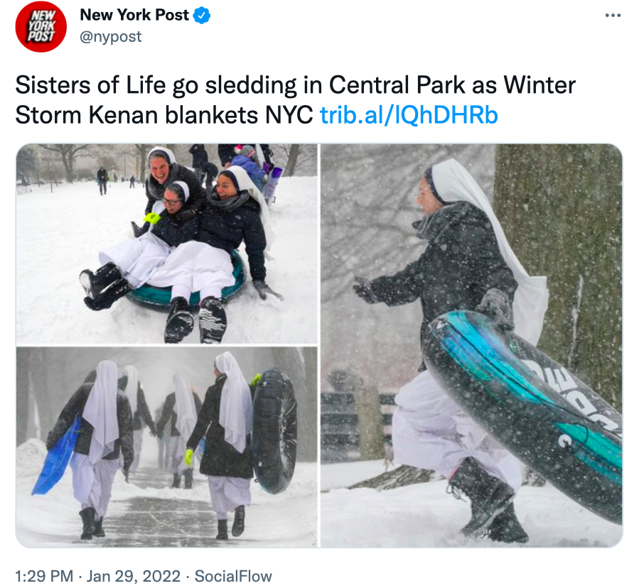 The post reads, “Sisters of Life go sledding in Central Park as Winter Storm Kenan blankets NYC.”