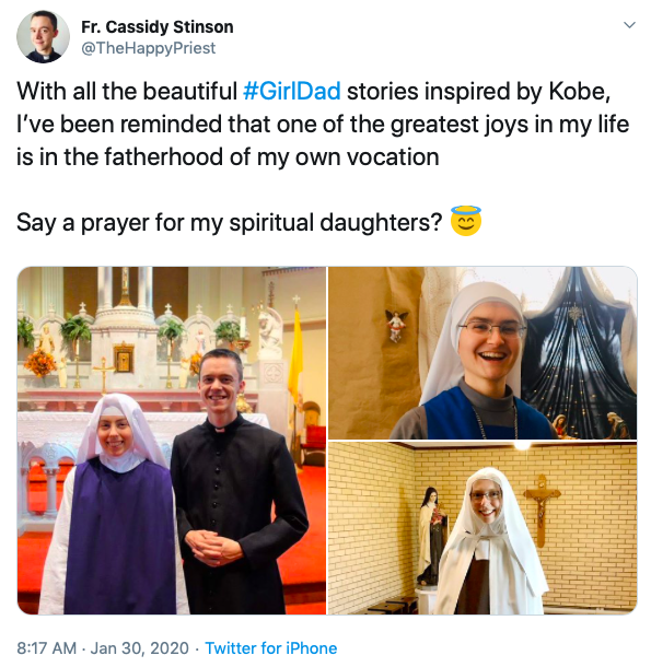 Fr. Stinson’s full tweet reads, “With all the beautiful #GirlDad stories inspired by Kobe, I’ve been reminded that one of the greatest joys in my life is in the fatherhood of my own vocation. / Say a prayer for my spiritual daughters? 😇”