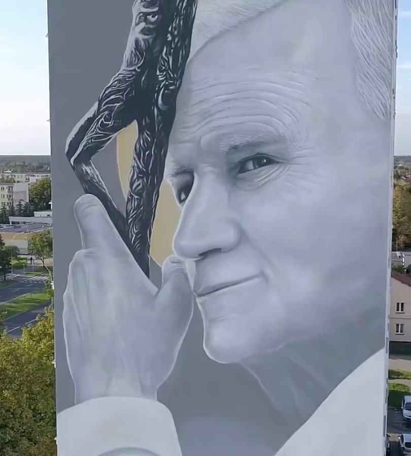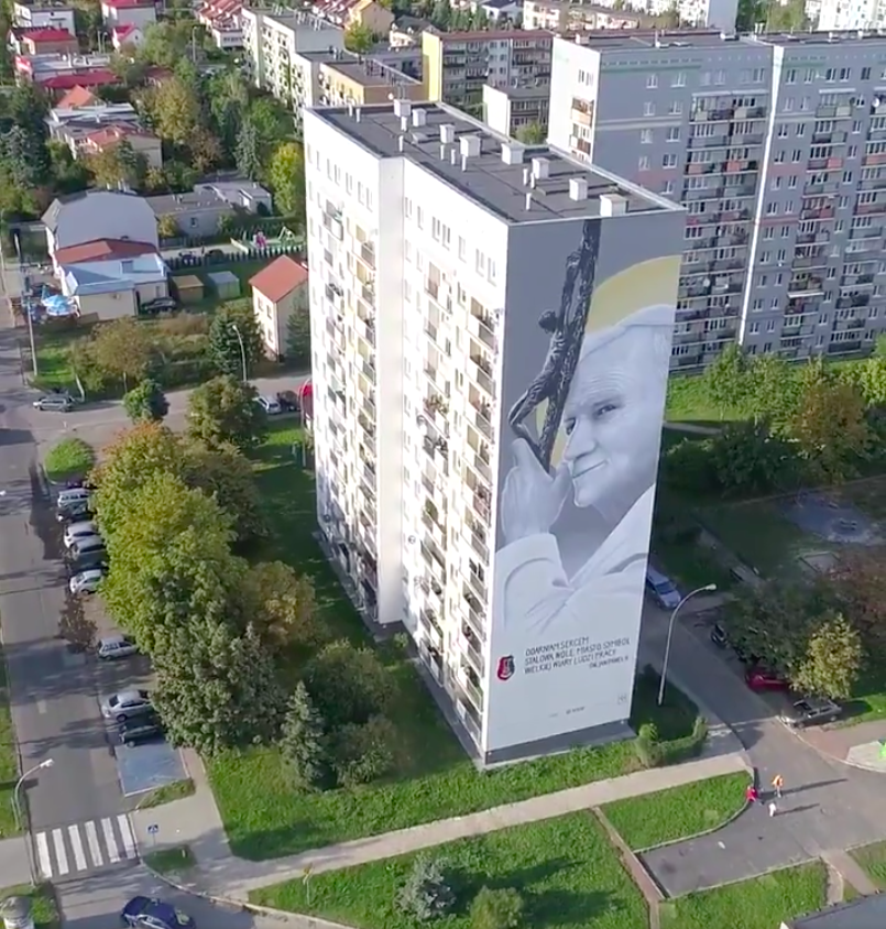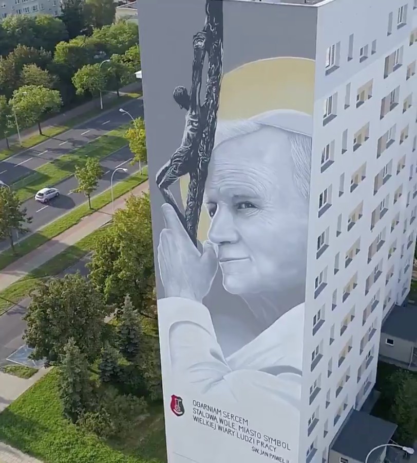 Stalowa Wola, Poland hired artist Piotr Topczyłko to paint a giant mural of Pope St. John Paul II on the side of an apartment building along the city’s John Paul II Avenue.