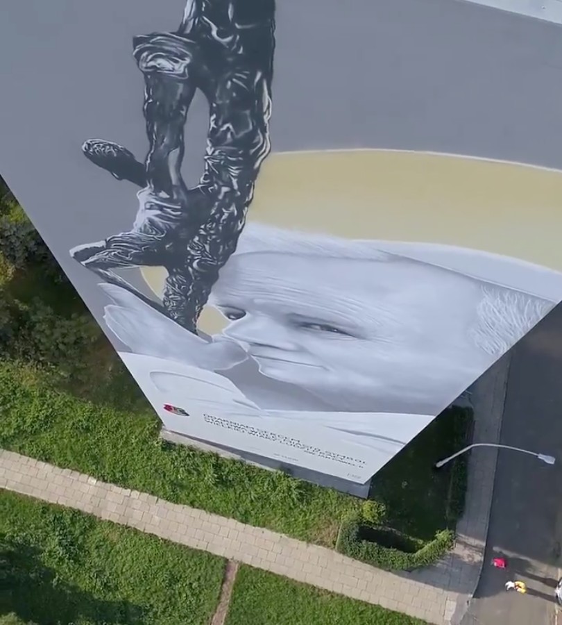 W Stalowej Woli na 30 metrowej ścianie wieżowca powstał niezwykły mural z wizerunkiem Świętego Jana Pawła II. Na krótkim filmie widać jak autor Piotr Topczyłko tworzy piękny mural Papieża.