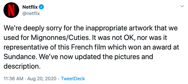 Netflix’s full tweet reads, “We’re deeply sorry for the inappropriate artwork that we used for Mignonnes/Cuties. It was not OK, nor was it representative of this French film which won an award at Sundance. We’ve now updated the pictures and description.”