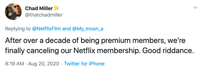 Chad Miller also wrote, “After over a decade of being premium members, we’re finally canceling our Netflix membership. Good riddance.”