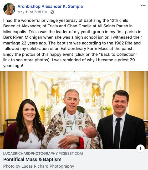 “I had the wonderful privilege yesterday of baptizing the 12th child, Benedict Alexander, of Tricia and Chad Cmelja at All Saints Parish in Minneapolis,” Archbishop Sample said in this Facebook post.
