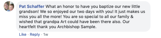 “It just makes us miss you all the more! You are so special to all our family & wished that grandpa Art could have been there also. Our heartfelt thank you Archbishop Sample.”