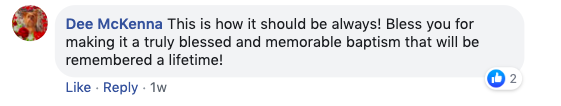 Commenter Dee McKenna said, This is how it should be always! Bless you for making it a truly blessed and memorable baptism that will be remembered for a lifetime!”