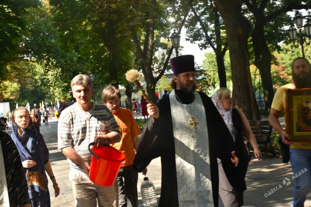 The head of the Missionary Department of the Eastern Orthodox Diocese of Odessa Fr. Oleg Mokryak led the cleansing, with help from a group of laypeople. Together, the dispensed holy water on people, the road, and on monuments as they walked, explaining to onlookers that they were specifically cleansing the area following the LGBT parade.