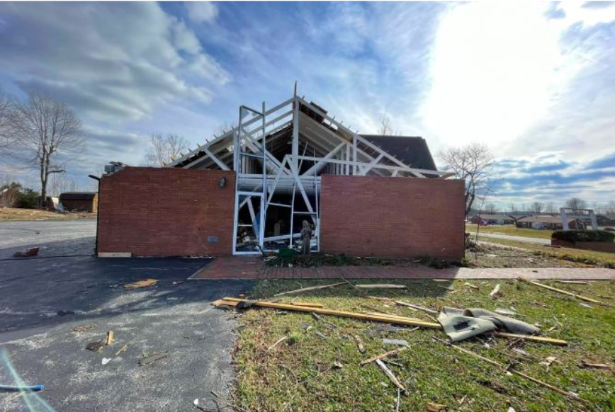 The church’s roof blew off and the windows and doors blew out. Debris surrounds the nearly destroyed building.