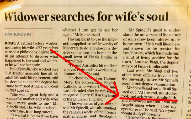 This guy is amazing! Bishop Richard Umbers of Sydney, Australia recently shared on his Facebook page a news article about an amazing man named Italo Spinelli. Titled “Widower searches for wife’s soul,” the article appeared in the Australian Times (behind a paywall). “A retired factory worker mourning his wife...