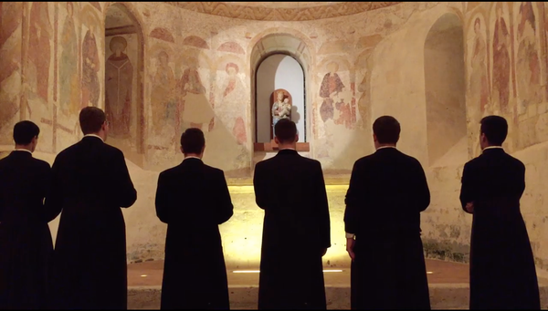 Credo in Deum Patrem omnipotentem, Creatorem caeli et terrae. Et in Iesum Christum, Filium Eius unicum, Dominum nostrum, qui conceptus est de Spiritu Sancto, natus ex Maria Virgine, passus sub Pontio Pilato, crucifixus, mortuus, et sepultus, descendit ad inferos, tertia die resurrexit a mortuis, ascendit ad caelos, sedet ad dexteram...