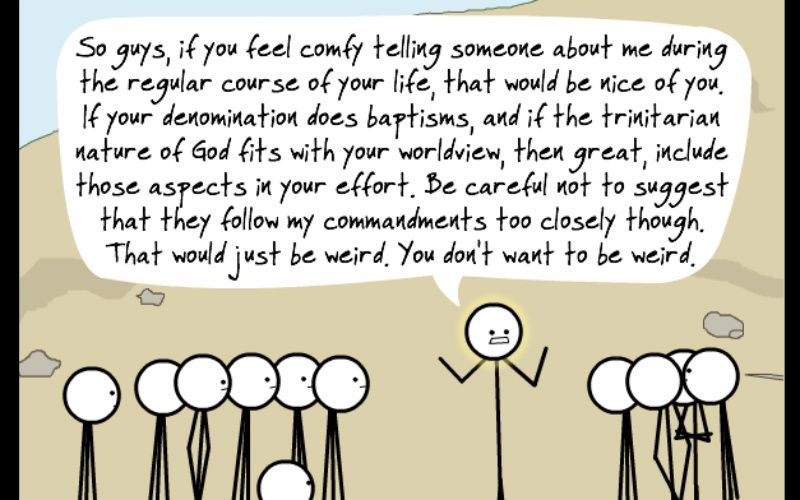 [See also: 11 of the Best #ThingsJesusNeverSaid] [See also: C.S. Lewis’ Profound Answer to Why God Remains Silent, Even in Suffering] Comic from Adam4d.com Here’s the actual text of the Great Commission, in case you were wondering: Go and make disciples of all nations, baptizing them in...
