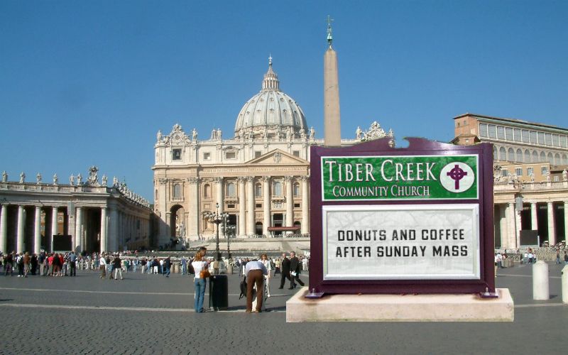 ROME, Italy — Pope Francis has changed the name of St. Peter’s Basilica to “Tiber Creek Community Church,” Vatican spokesperson Fr. Federico Lombardi announced this morning. “The greatest church of Christendom, built on the holy grave of the martyr-prince of the Apostles, has been known as ‘St. Peter’s Basilica’...