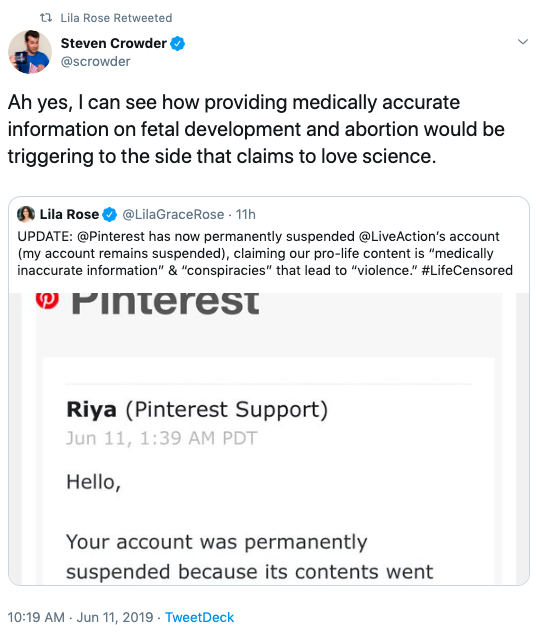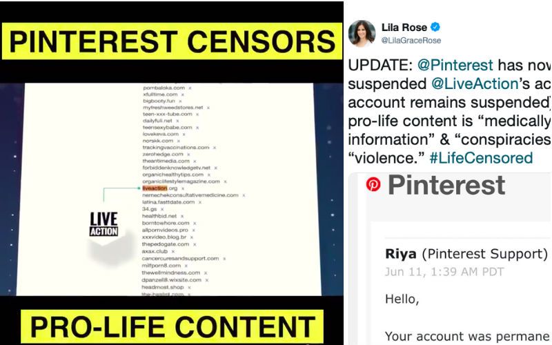 UPDATE: @Pinterest has now permanently suspended @LiveAction’s account (my account remains suspended), claiming our pro-life content is “medically inaccurate information” & “conspiracies” that lead to “violence.” #LifeCensored pic.twitter.com/zSoIgbVcSX