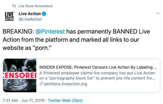 Rose’s full tweet reads, Pinterest has now totally banned @LiveAction from the platform, claiming we provide ‘medically inaccurate information.’ / WHAT exactly is medically inaccurate, @Pinterest? Our website’s education on abortion procedures was developed by OBGYNs & abortion doctors. / #LifeCensored”.
